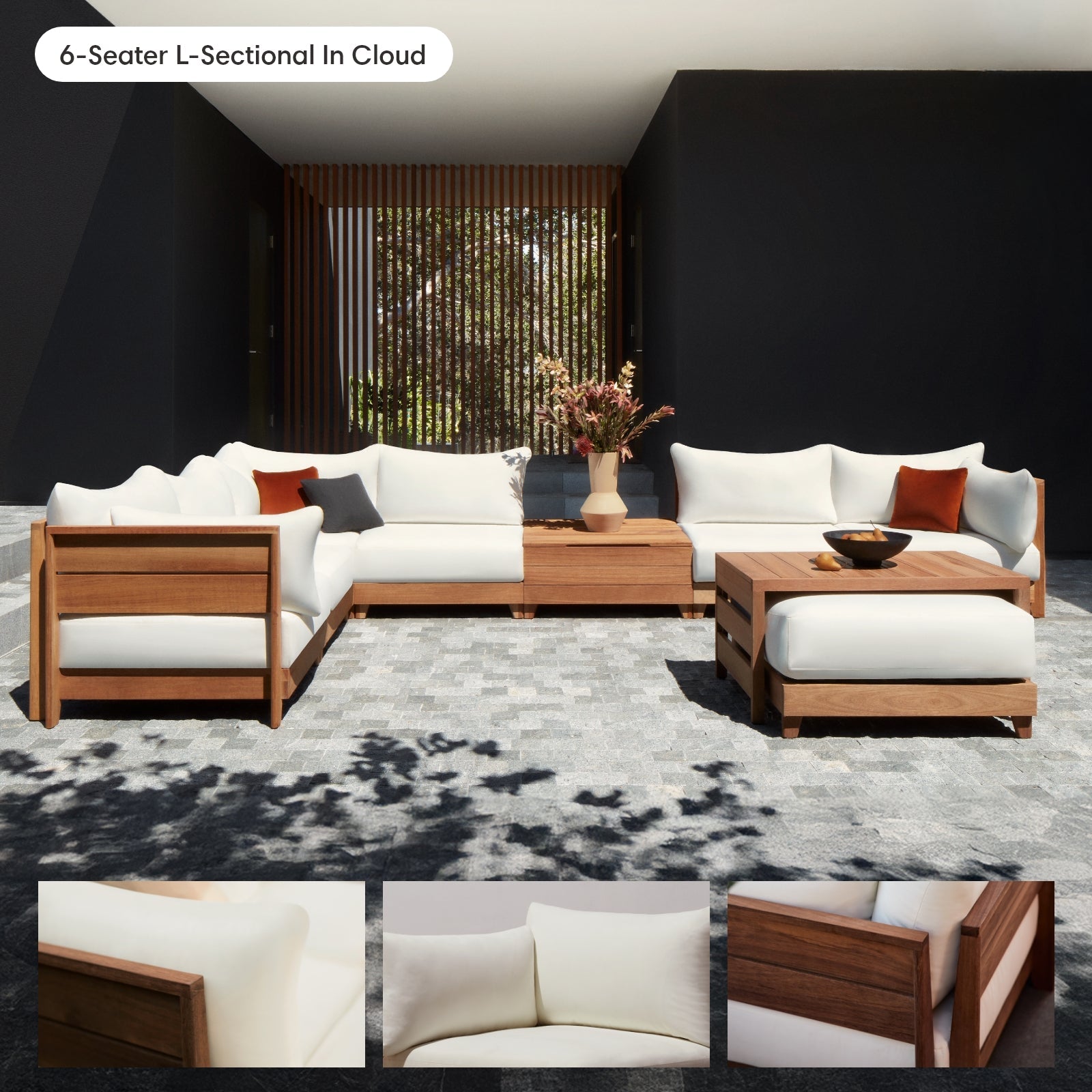 Our patent pending outdoor living collection is designed to move. Adapt and rearrange each module as you please to create your dream custom outdoor living configuration. The slatted solid wood panels can be used interchangeably on all seat modules and base blocks can be connected to one another in any direction! Place a storage coffee table between two seats for a modern inline lounge look or connect an ottoman to your loveseat and create a 2-seater sectional! Make it your way, depending on the day.