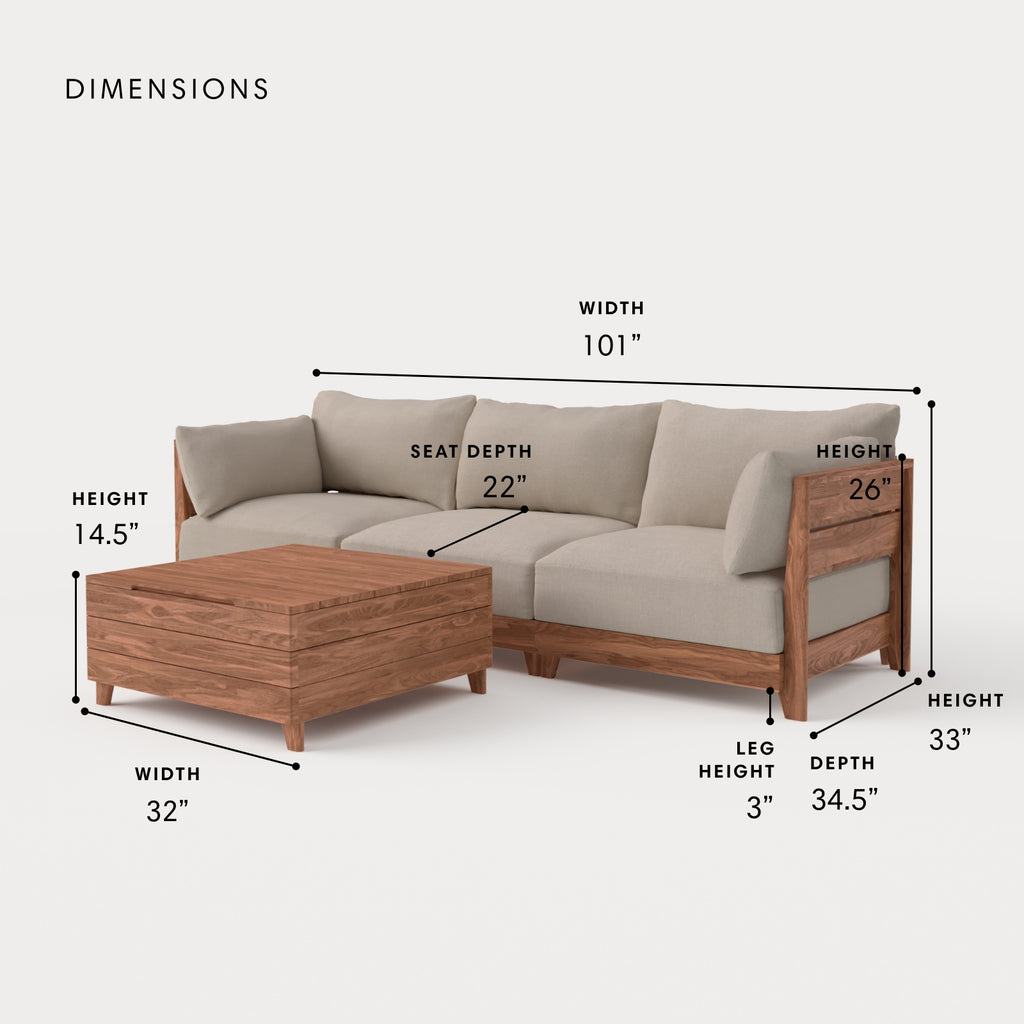 Our patent pending outdoor living collection is designed to move. Adapt and rearrange each module as you please to create your dream custom outdoor living configuration. The slatted solid wood panels can be used interchangeably on all seat modules and base blocks can be connected to one another in any direction! Place a storage coffee table between two seats for a modern inline lounge look or connect an ottoman to your loveseat and create a 2-seater sectional! Make it your way, depending on the day.