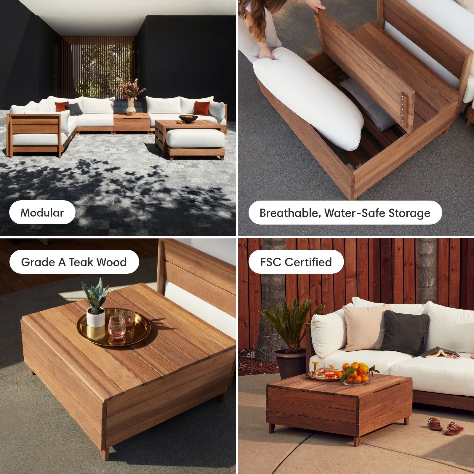 Our patent pending outdoor living collection is designed to move. Adapt and rearrange each module as you please to create your dream custom outdoor living configuration. The slatted solid wood panels can be used interchangeably on all seat modules and base blocks can be connected to one another in any direction! Place a storage coffee table between two seats for a modern inline lounge look or connect an ottoman to your loveseat and create a 2-seater sectional! Make it your way, depending on the day.