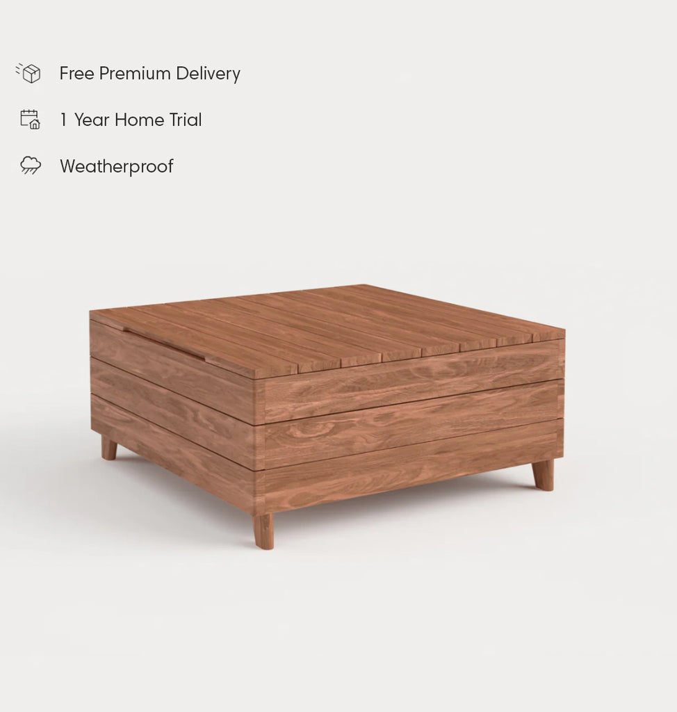 This outdoor storage compartment is ideal for storing weatherproof outdoor covers when they’re not in use. The two-part removable slatted lid is designed to resist rain pooling while it serves as a beautiful coffee table surface. Both the top and bottom panels allow water to pass through as needed for optimal self-drying.