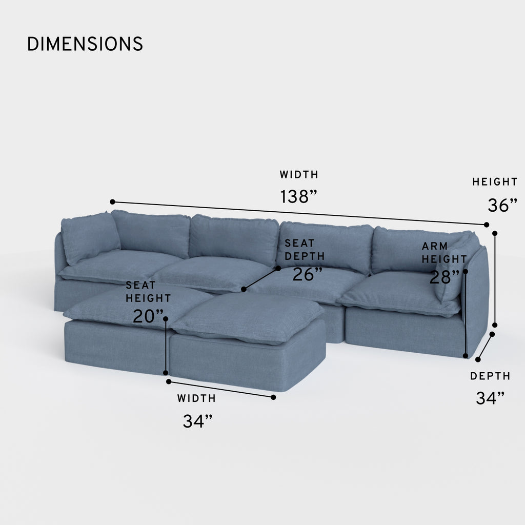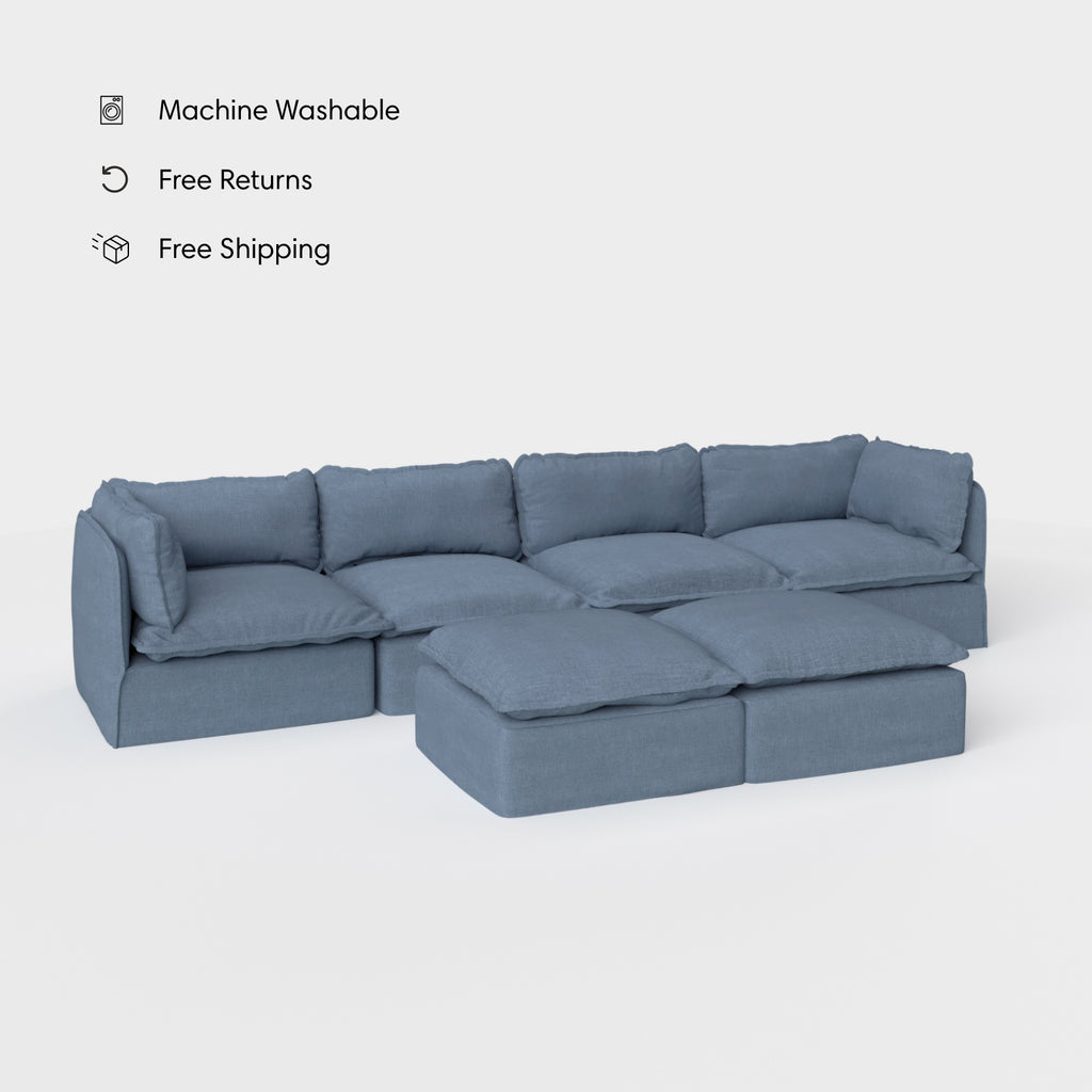 Modular Outdoor Washable 4-Seater + Bench Ottoman | Classic Canvas in Ocean