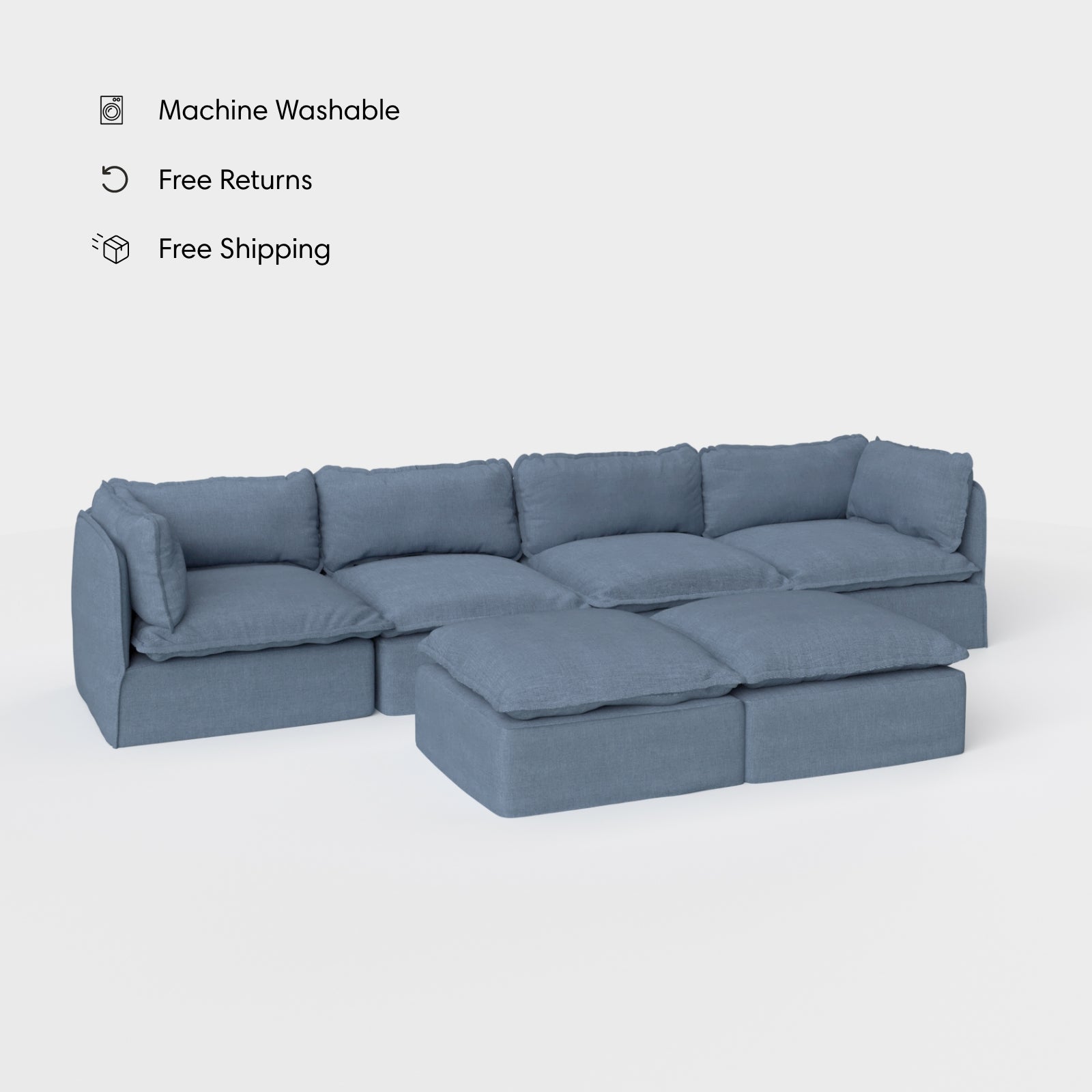 This modular product ships Parcel delivery in lightweight, easy-to-manage boxes. They fit through any door and they are easy to move, reconfigure & store. Our proprietary eco-shipping design enables a fast, sustainable shipment. Assembly includes arranging your frame, slipping on the washable upholstered frame duvet, and dressing it with your performance covers.